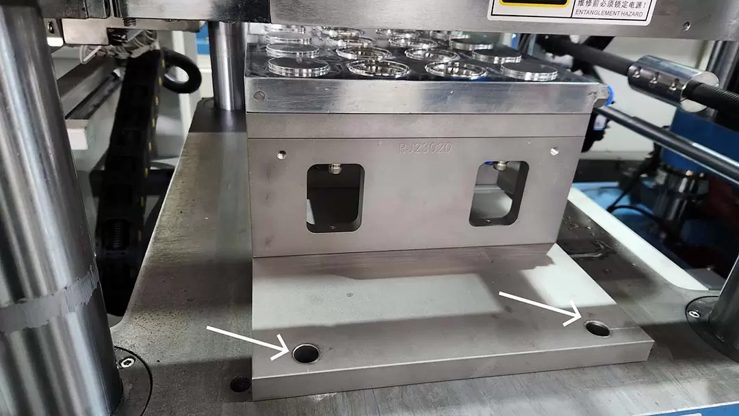 পাঞ্চিং স্টেশন: প্রেস এসএস পাঞ্চটিকে দ্রুত চাপ দেওয়ার জন্য চালিত করে এবং পাঞ্চিং ডাইয়ের মাধ্যমে প্লাস্টিক পণ্যের গর্তগুলিকে খোঁচা দেয়।