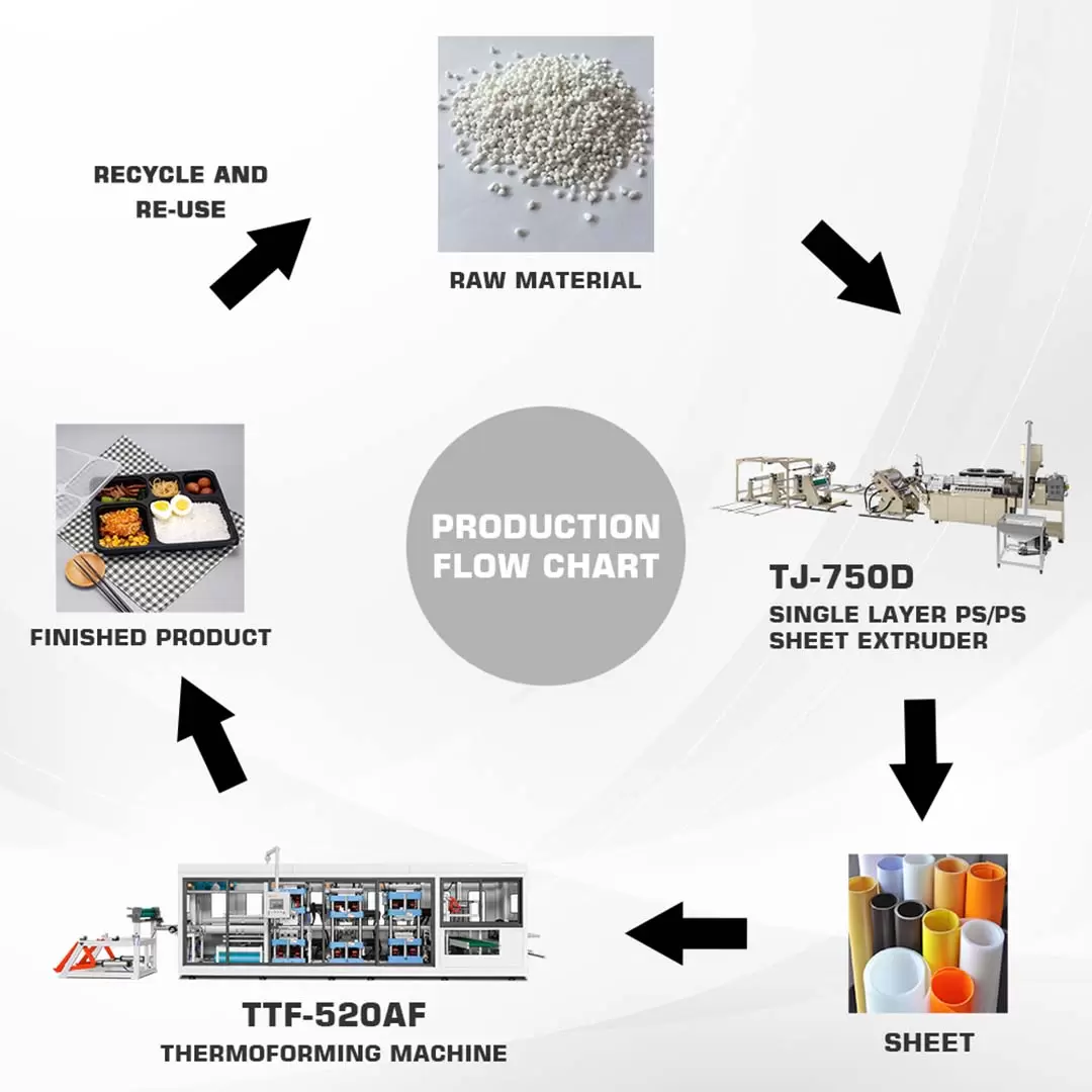 উৎপাদন প্রক্রিয়ার সময় প্লাস্টিক থার্মোফর্মিং মেশিন দ্বারা উৎপন্ন শিট বর্জ্য পুনর্ব্যবহার করা যেতে পারে। বর্জ্য পুনর্ব্যবহারের মাধ্যমে, পরিবেশে প্লাস্টিক বর্জ্যের দূষণ হ্রাস পায় এবং ল্যান্ডফিল এবং প্লাস্টিক বর্জ্য পুড়িয়ে ফেলার ফলে সৃষ্ট পরিবেশগত বোঝা হ্রাস পায়।